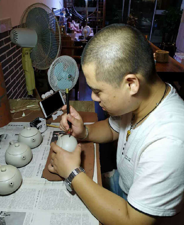 顾科乐简介:男,宜兴人,1978年生,国家级助理工艺美术师,中国工艺美术学会会员,江苏省陶瓷艺术委员会会员,从小在紫砂的制作声中长大,自幼对书画颇感兴趣,所以紫砂陶刻在他心中,犹如一颗早早深植于一片沃土中的种子,等待着雨季的来临,2005年正式从艺于陶刻事业,有幸得到业内高人的指点,潜心研究,篆刻功力一日千里,能把字画与壶融为一体,字画以壶为美,壶以字画为贵。路漫漫其修远兮,吾将上下而求索。艺术之路虽艰辛而漫长,但创作之情在他心中一直如汪洋大海,生生不息。