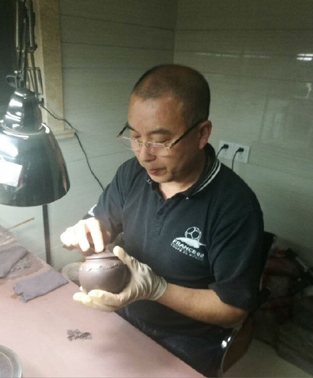 吴小忠简介:男,宜兴人,1968年生,国家级助理工艺美术师,1987年开始拜师学习制壶以及壶艺创作设计,经多位名师、益友指点督导,获益匪浅。作品特点:以全手工薄胎壶为主,光素器、花器、方器技术全面,注重在传统技法上求变化,壶风俊秀细腻简洁,线条流畅富有时代气息。