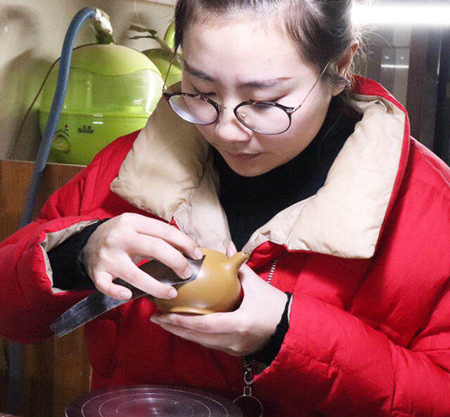 蔡菲简介:女,宜兴人,1994年生,国家级助理工艺美术师,在父亲蔡志君的指导下,其作品尤以朱泥小壶见长,质地古朴,韵味淳厚。后经高级工艺美术师顾顺芳指导,通过自己摸索学习,在花器领域也有所精进。
