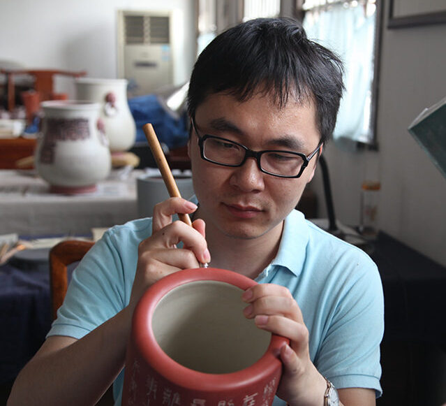 郁志浩简介:男,宜兴人,1987年生于,国家级助理工艺美术师,自幼熟悉紫砂壶制作技艺,跟随父亲学习紫砂壶制作,善于方壶制作,其作品朴实大方,又具有创新艺术。后跟随宋鸿伟学习书法,并在多届书法比赛中获得优秀奖项,拜江苏省工艺美术大师范建军研习紫砂陶刻,2012年进入南京师范大学艺术设计专业学习。在师傅的教导下,练就了扎实的基本功。在学习传统陶刻技艺的同时尝试新的陶刻技法。作品简洁、韵味十足。在多次大赛中获得奖项。多次与山西省书画院院长李世南、国家画院院长张江舟、国家一级美术师李孝萱等知名画家倾力合作,作品深受广大收藏家喜爱并予以收藏。