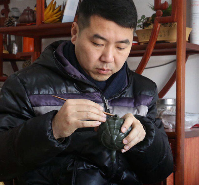 余超简介:男,宜兴人,1987年生,国家级助理工艺美术师,学校毕业后跟随师父袁国强学习全手工圆器制作。后又拜李静为师,学习筋纹器制作。制壶过程中潜心钻研,刻苦努力和细心借鉴,取人之长融会贯通。使自己的制壶技艺得到进一步的提升。