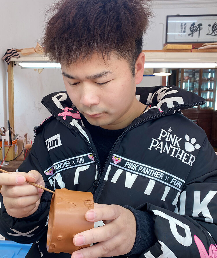 吕丞简介:男,宜兴人,1991年生,国家级助理工艺美术师,2013年进修于南京师范大学。自幼受前辈制壶艺术的影响,对紫砂产生了浓厚的兴趣,开始了对紫砂壶的设计与制作。在工艺美术师翟红芳老师的悉心指导下壶艺有了长足的进展,又对紫砂壶的装饰上有了较深的研究与创新。在“品逸轩”陶艺工作室,充分运用五色陶土的色彩,作品注入了个人情感,注重图案的变化,在制作上方圆并施,开创了自己独特的风格。