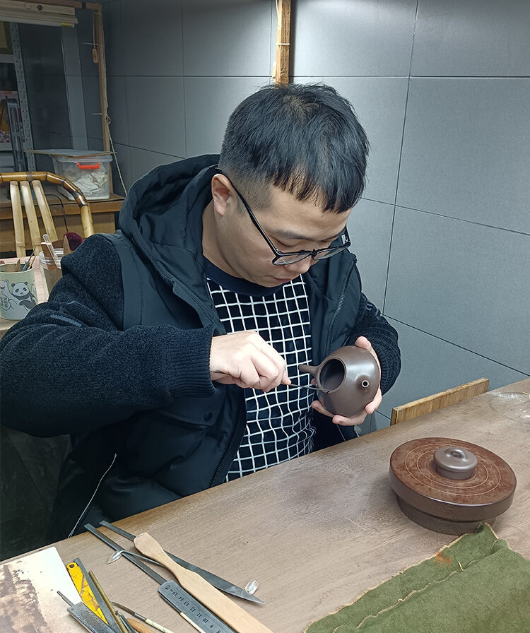 高振捷简介:男,宜兴人,1994年生,国家级助理工艺美术师,2009年进丁蜀高等职业学校紫砂班,2012毕业后跟随高级工艺美术师杨丽萍学习紫砂技艺。擅长全手工光素器制作,其作品有形有神,工艺细腻,体现了紫砂壶的古典之美。