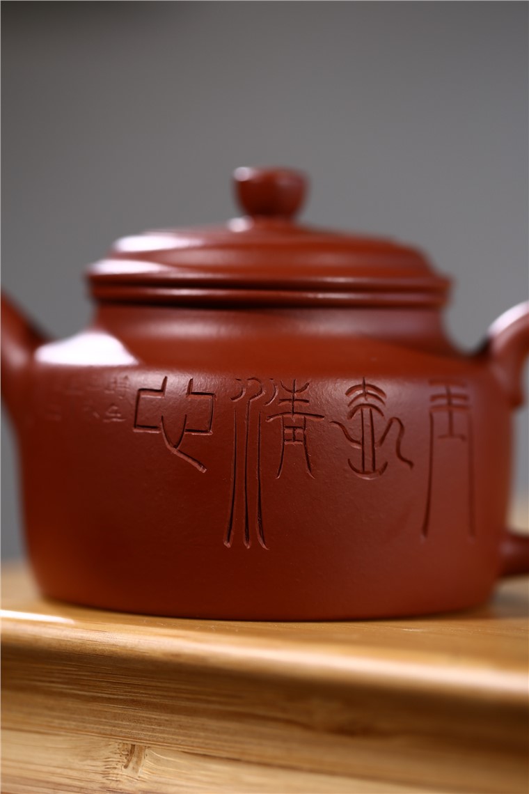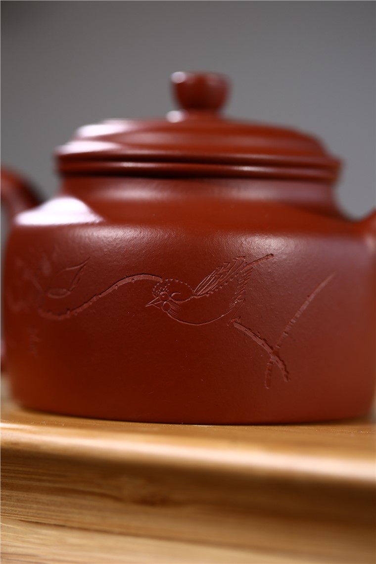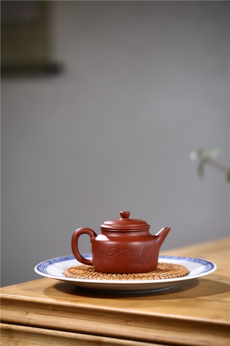 此壶给人以清新雅趣之意,形制优美,色泽温润,壶身刻绘精妙绝伦,整个壶体集稳重和精巧于一体。实乃赏茗佳品!