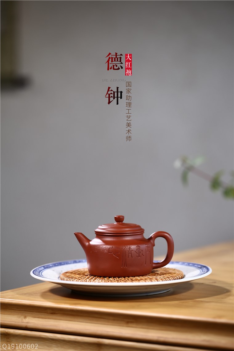 德钟,壶型为钟,德,是修辞,最俱代表的作品便邵大亨的德钟壶,大亨所创光素造型代表作中的又一佳器。器形端庄稳重,比例协调,结构严谨,泥色紫润,系最佳天青泥之呈色。技艺手法的表现已达紫砂传统基础技艺的巅峰。壶身手感极佳,触摸舒服,造型简洁质朴,一洗清季宫廷之繁缛习气。壶盖内有“大亨”楷书瓜子形印。