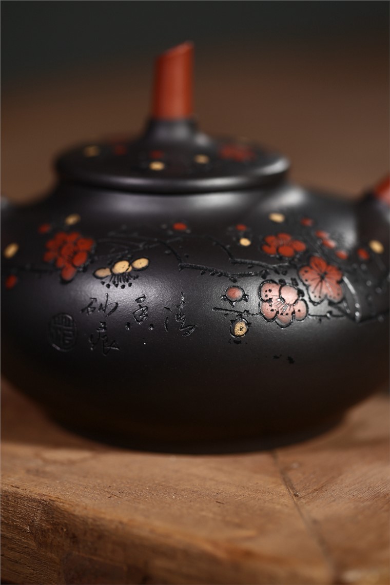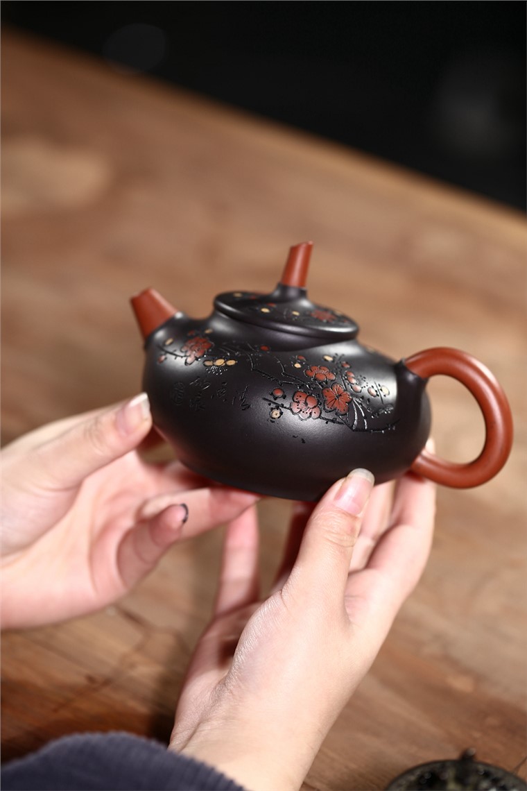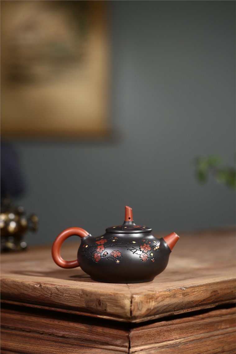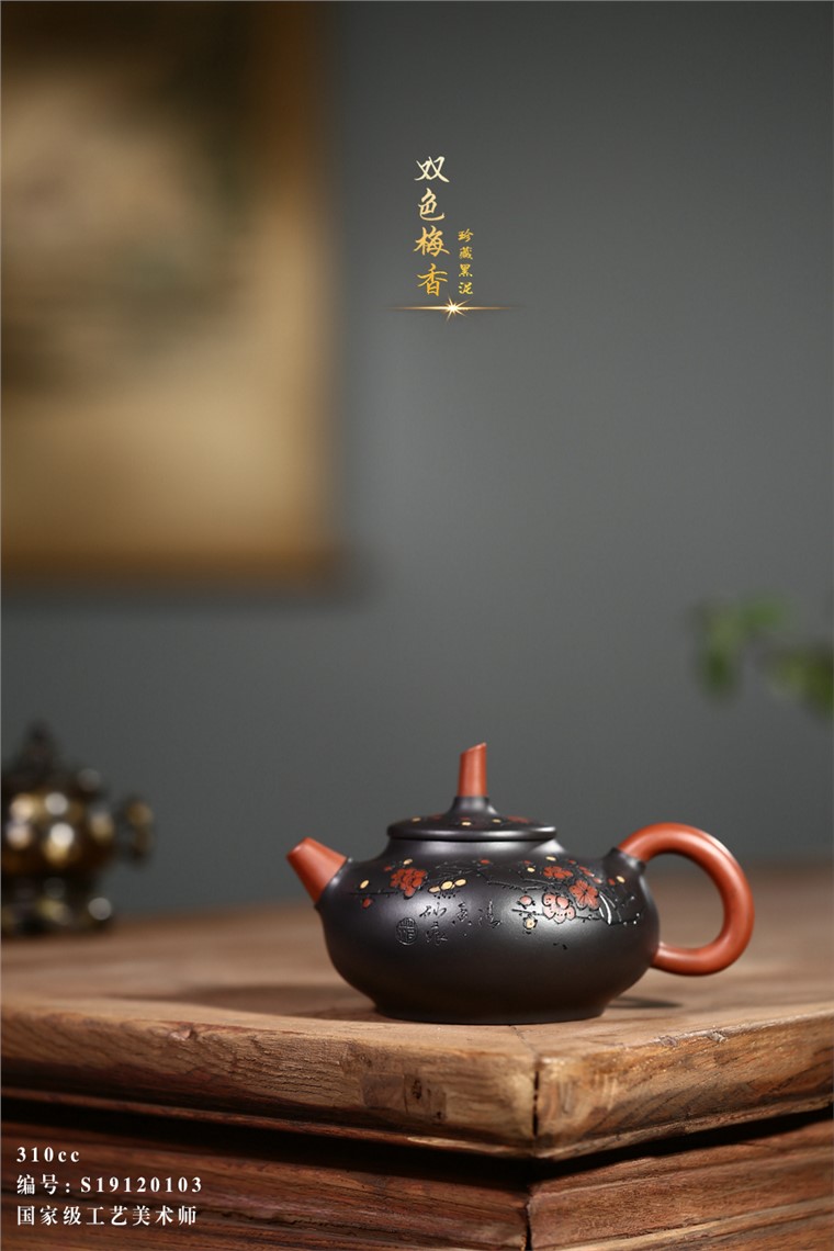原矿黑泥,其色如墨,似黑夜浩瀚天际,深不可测。神秘静寂、引人神往,故历来深受世人钟爱。为早期常见通用之泥料,因矿脉里铁质成份较高,日久使用,深获早期壶识者深爱、赞赏,养壶者甚是喜爱。新壶初用砂土气重,茶汤略现砂气,经使用壶身展现出灰黑,泡茶数日则如墨黑,泡茶好喝。