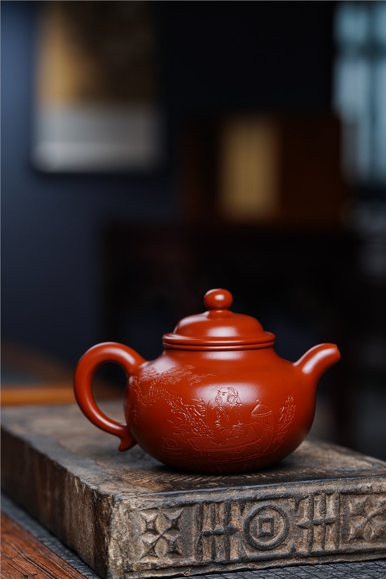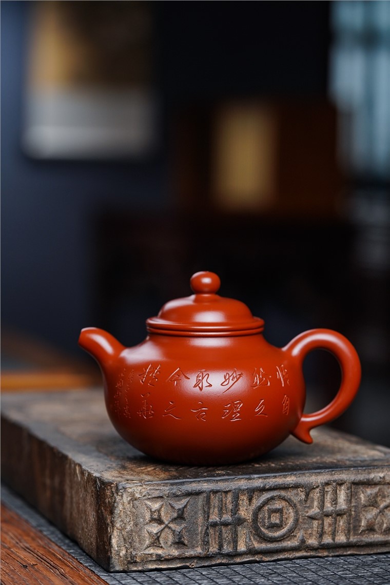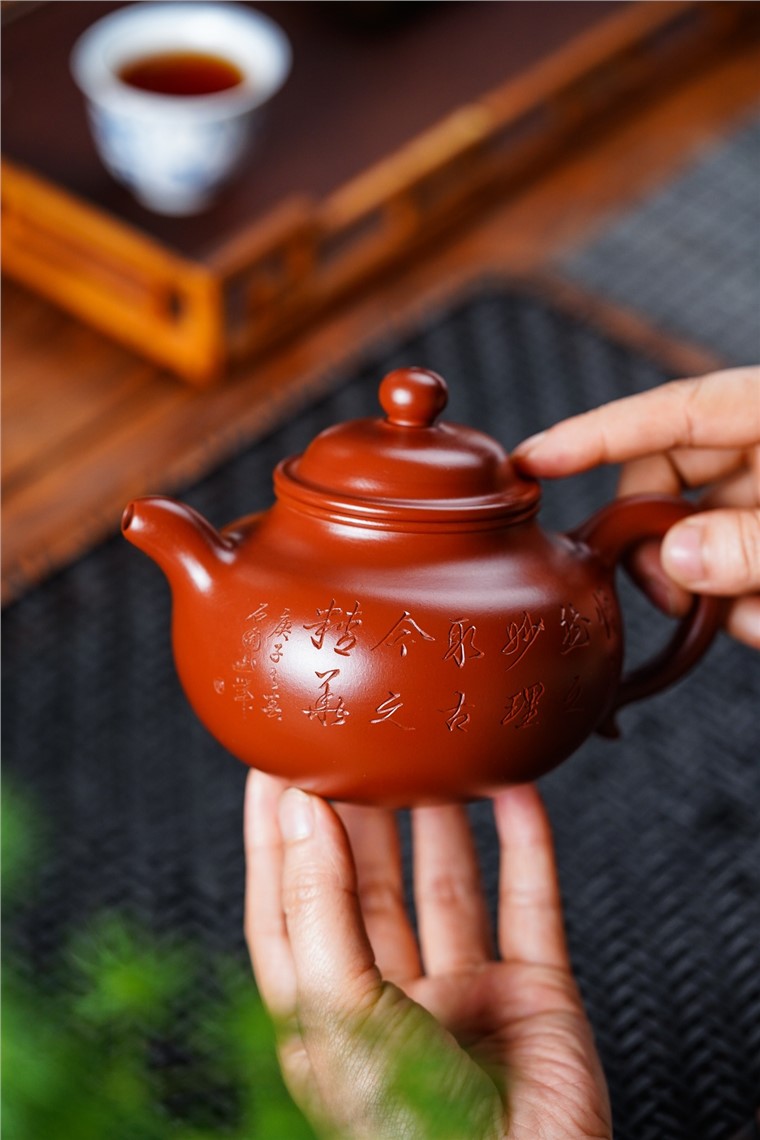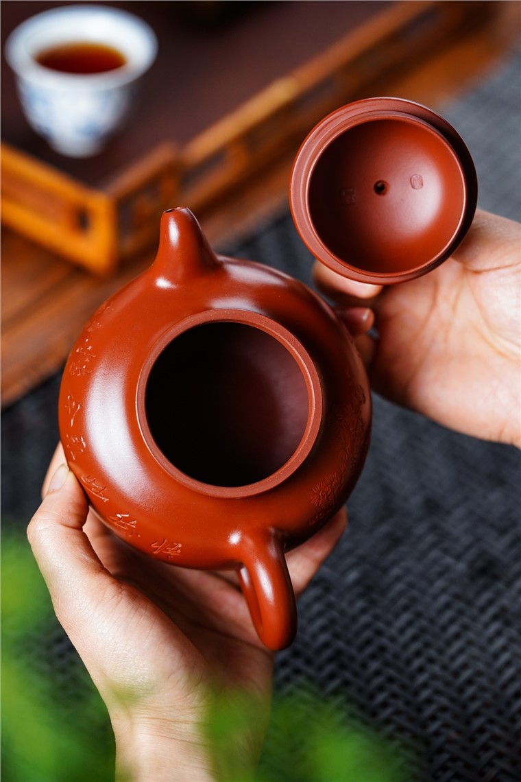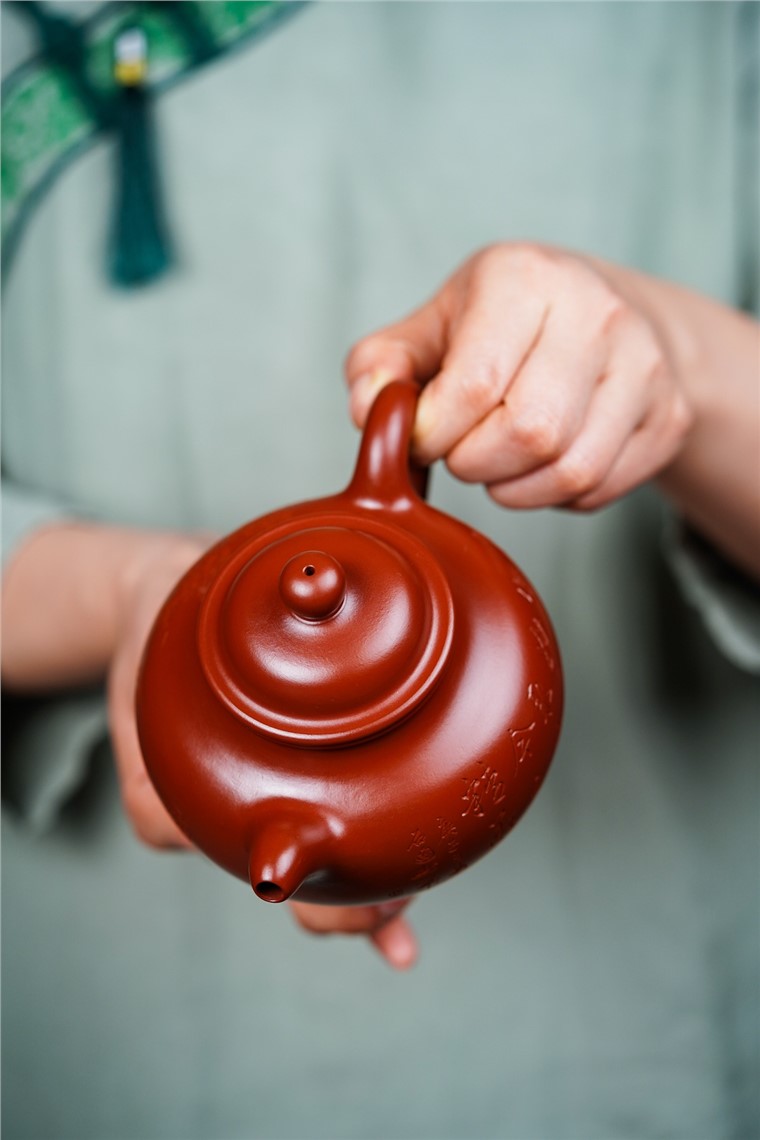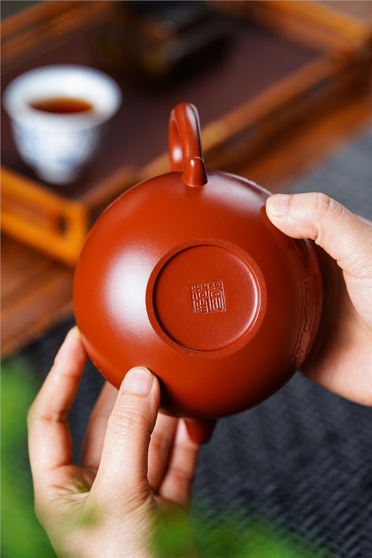 大红袍,产于江苏宜兴丁山赵庄山、黄石黄岩心,刚挖出来时为鹅黄色,制成后则转色为瑰丽的朱红色,壶身表面偶然能看到细小的铁质,还有点滴银心片,为濒临绝灭之朱泥。所制作品,红艳夺目,气质高雅,明艳生香或热情洋溢,养成则通透亮泽,观之则暖意顿生,令观者满受瑞气临身,鸿运当头之感! 温馨提醒:使用须先温壶。