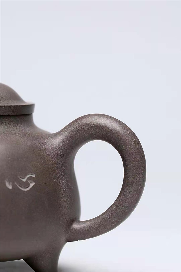 陶者谓之“青灰泥”,古云“天青色”,陶之色调呈蓝、绿与灰之复合色,以烧成色命名之,又称“藏青灰泥”,易与墨绿泥混淆,为明末清初广为流传之泥料,近年来开采量少,故成品甚稀;呈深紫灰色调,因满布颗粒,触感特殊,玩家喜呼“鲨鱼皮”,是难觅之珍贵稀有泥料之一。原矿收集不易,色泽特殊,故与器物形体线条之搭配,易产生不同效果,设计制作较为费心。色调傲然不群,气质高雅,稳重不浮夸