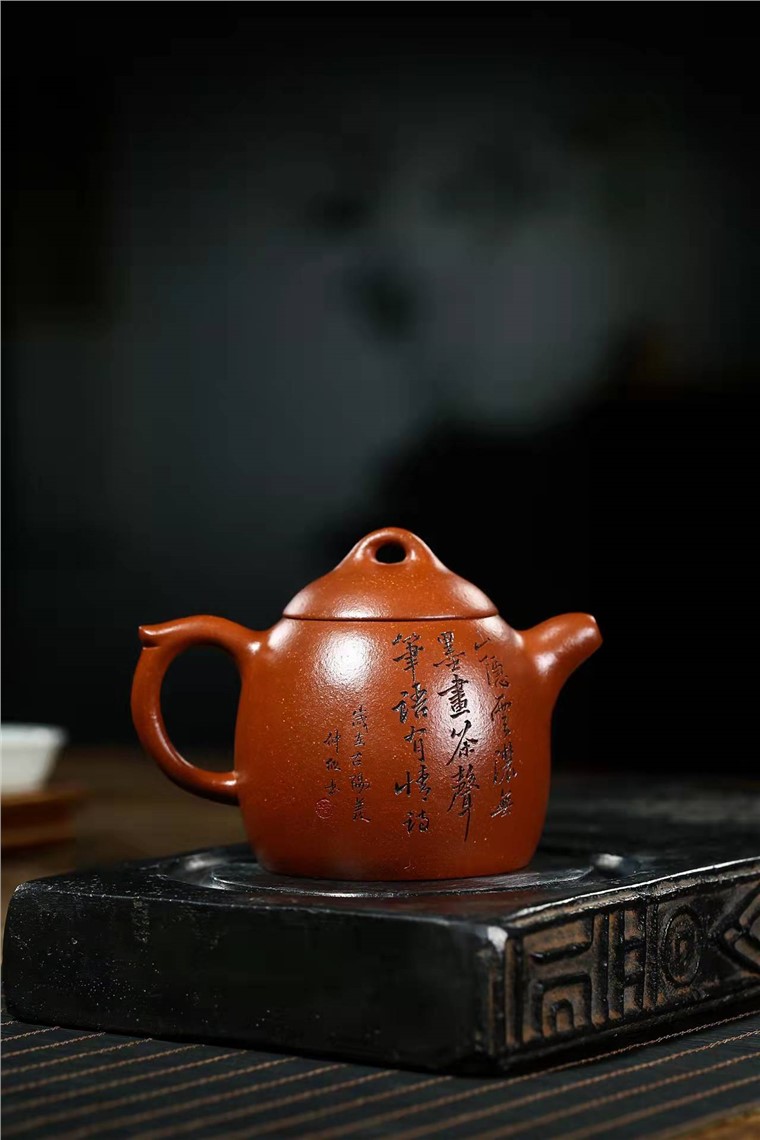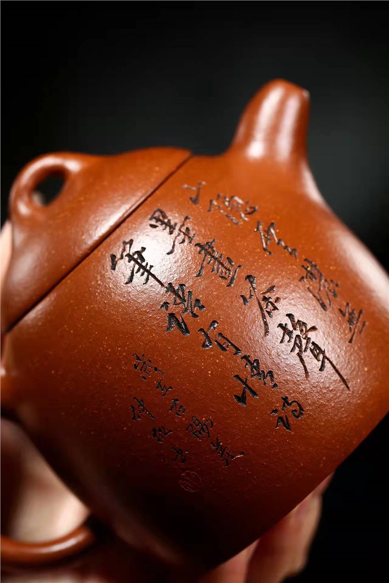 秦权:秦统一六国后统一了度量衡,“权”就是用来称量重量用的秤砣;“秦权”壶就是仿其外型。谁最早创制了秦权壶,不得而知。但晚清梅友竹与韵石合作,一如当年陈鸿寿与杨彭年的传奇。紫砂题铭,直追曼生,神采翻飞。“载船春茗桃源卖,自有人家带秤来。” 桃源卖茶,以壶为秤。充满了想象的意境和潇洒不羁的情趣。