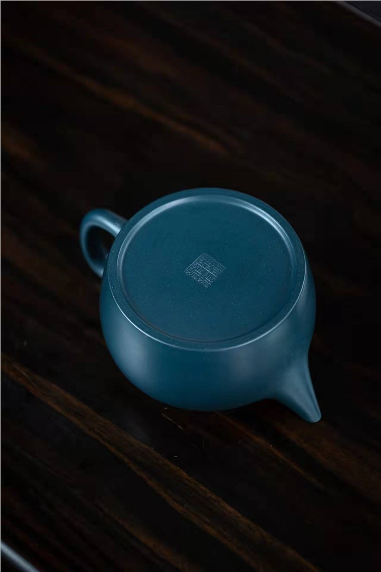 德钟,壶型为钟,德,是修辞,最俱代表的作品便邵大亨的德钟壶,大亨所创光素造型代表作中的又一佳器。器形端庄稳重,比例协调,结构严谨,泥色紫润,系最佳天青泥之呈色。技艺手法的表现已达紫砂传统基础技艺的巅峰。壶身手感极佳,触摸舒服,造型简洁质朴,一洗清季宫廷之繁缛习气。壶盖内有“大亨”楷书瓜子形印。