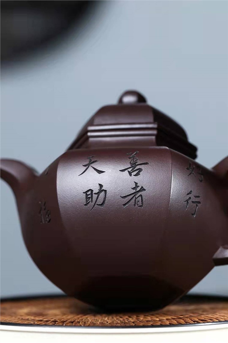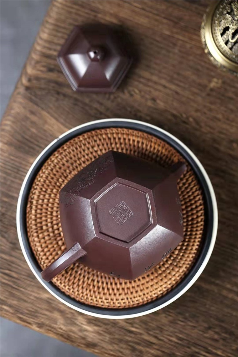 此款作品在制作工艺上难度更大,整个壶以六方为造型,上下收敛中间舒展,在简单之中求变化,上下连通一气,可谓构思巧妙。