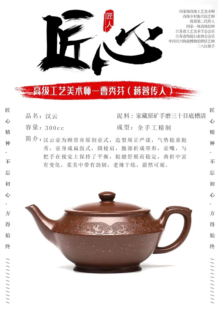 曹秀芬简介:女,宜兴人,1968年生,国家级高级工艺美术师,从小对紫砂耳濡目染,1986年进入紫砂工艺厂,多次得到国家级工艺美术大师徐汉棠先生指点,在多年的制壶过程中打下了扎实的基础,后跟随国家级工艺美术师许建生学习紫砂壶造型设计和创作且三十多年来刻苦钻研、潜心实践,形成了传统和现实相结合的风格。作品端庄秀美,做工精细,深得业界人士好评。