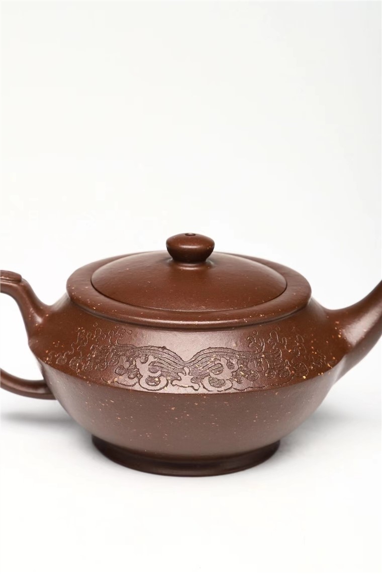 底槽青,产于江苏宜兴黄龙山系,紫泥原矿大致可分:头槽青、二槽青、底槽青等三类。底槽青产于紫泥矿料最底层,质量好,为历代陶人推崇之首,亦为数百年来经典名器,及已故顾景舟大师最钟爱之泥料;此泥矿名称,因产地宜兴方言沿用已久,为恐混淆,故用其音直译,以“底槽青”名之。早先产于黄龙山四号井,后来是黄龙山五号井和台西矿。由于产于紫砂的底层,质地特纯,泥质细腻、成色稳重,呈棕色,在近代制壶名家广泛使用。制成后细看壶表内有不均匀的细小金黄色或灰黄色颗粒,底槽青矿料中的“鸡眼”、“猫眼”粉碎后呈现的是黄色颗粒,因此底槽青泥料制成的壶表面有“金砂隐现”的说法,养成后色泽温润!