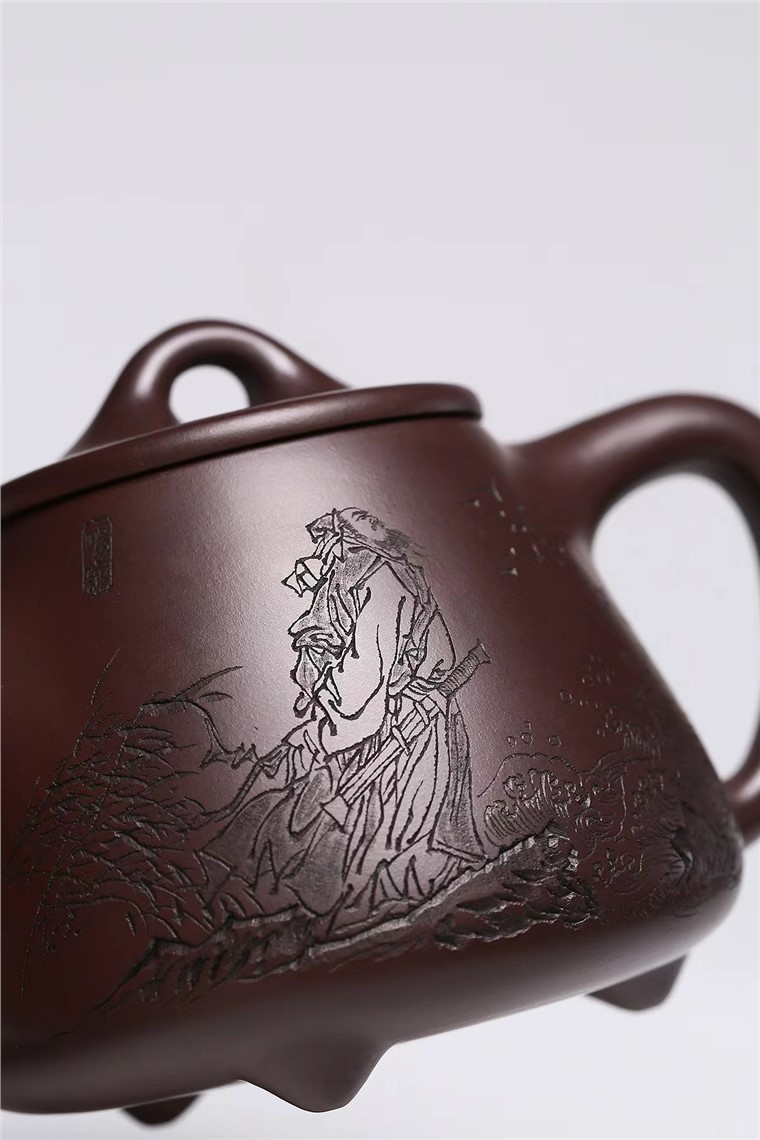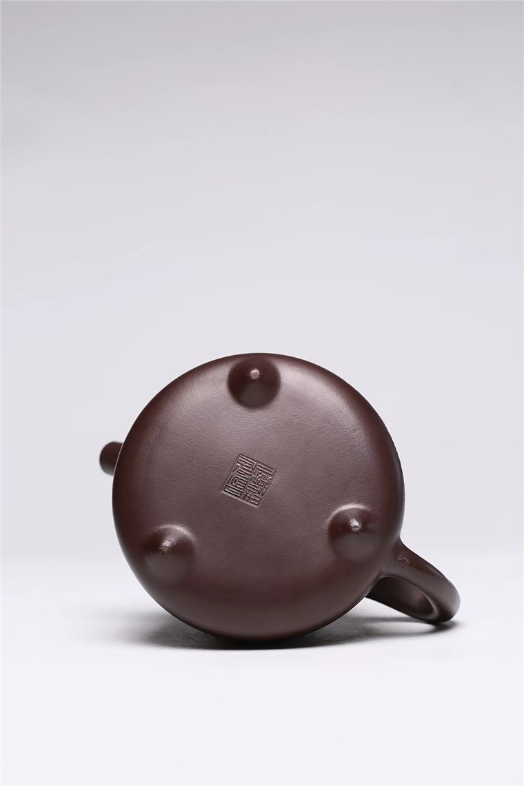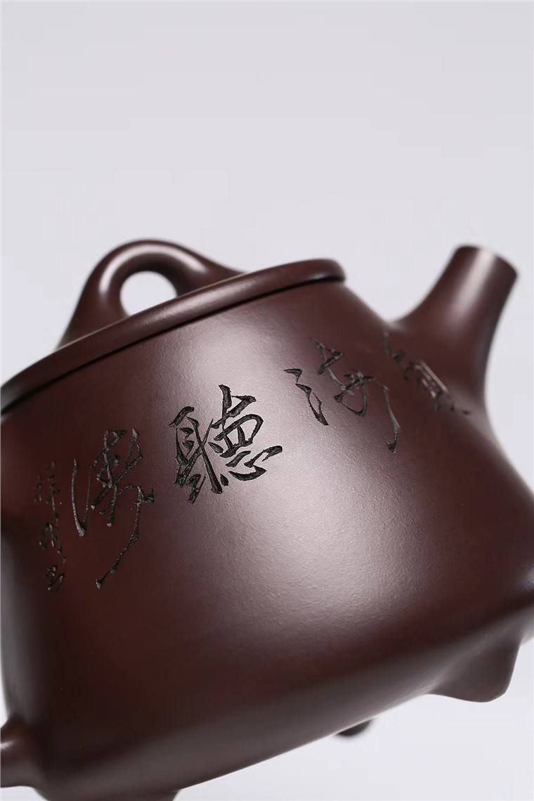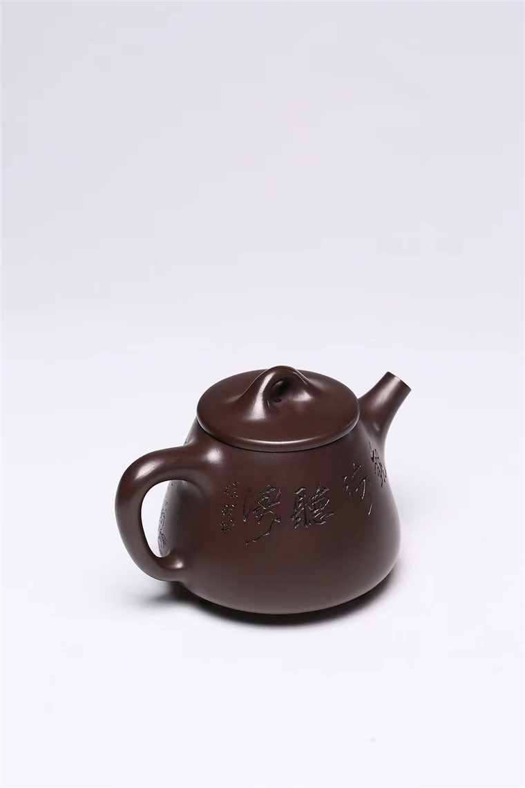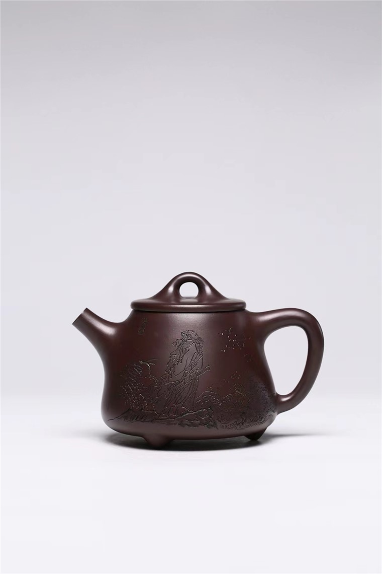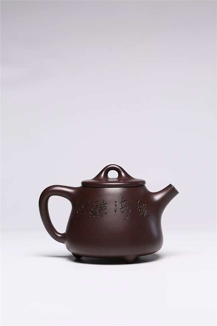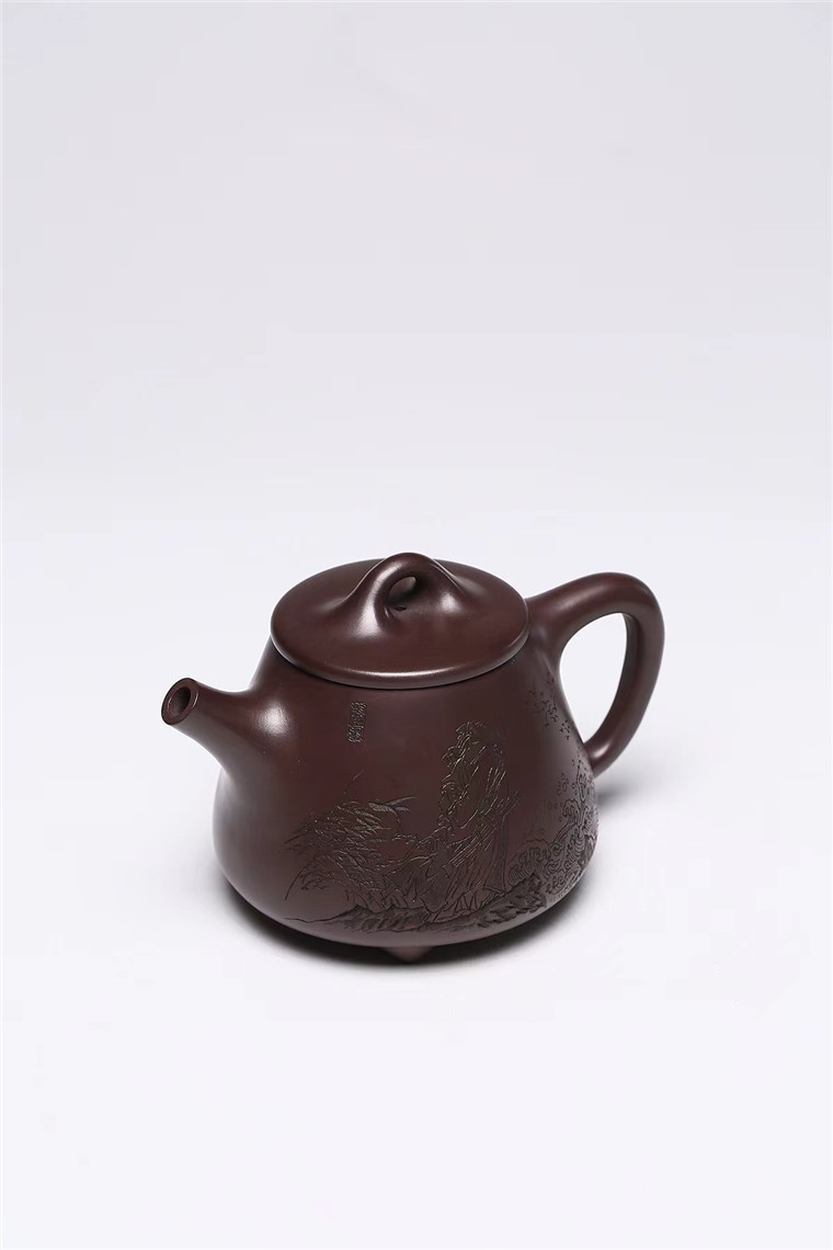此款高石瓢与传统石瓢壶有着异曲同工之妙,拔高的壶身让作品更显刚中有柔,和顺有力。平盖,压口严密,桥梁钮暗接与壶盖和谐统一。壶嘴短直暗接的处理,刚劲有力,圈把上浑下细,彰显曲线柔美之感。三乳足卧底,神韵自然,壶身刻绘,风度大气,回味无穷。
