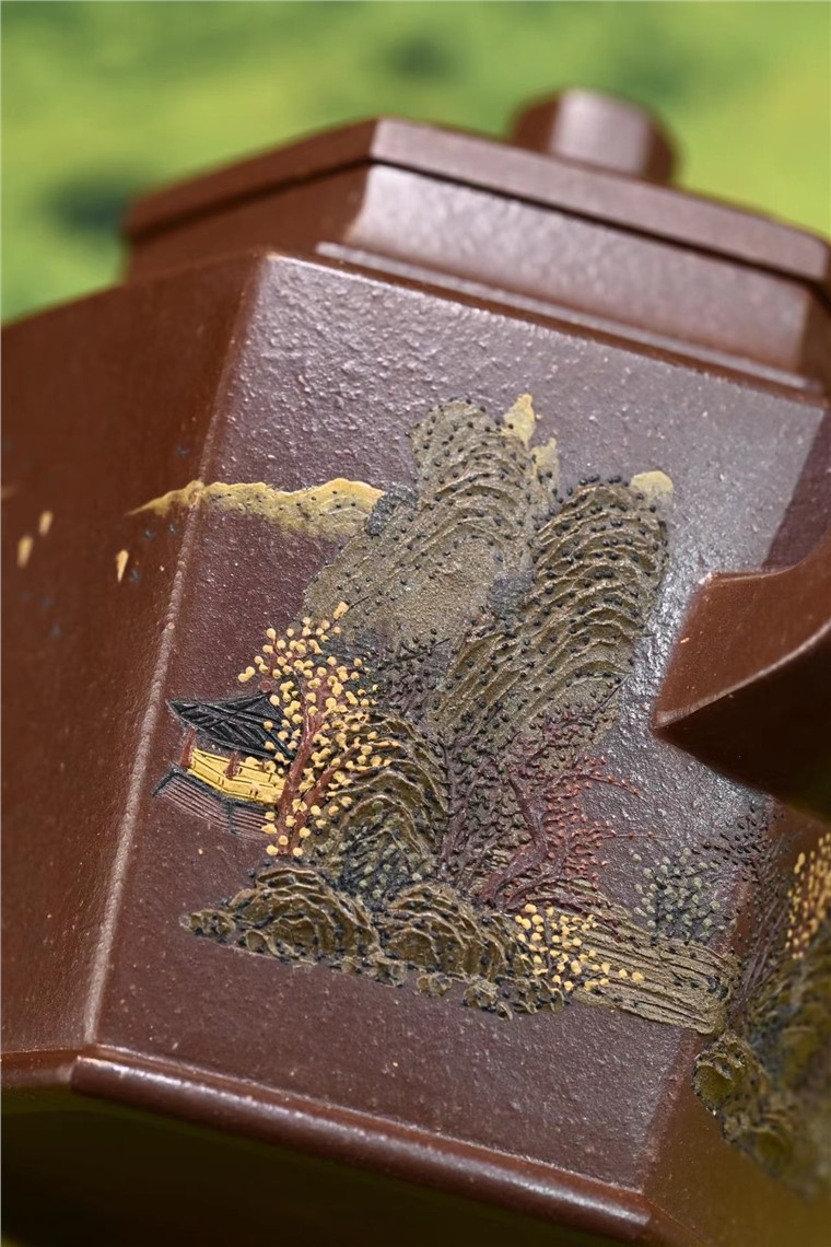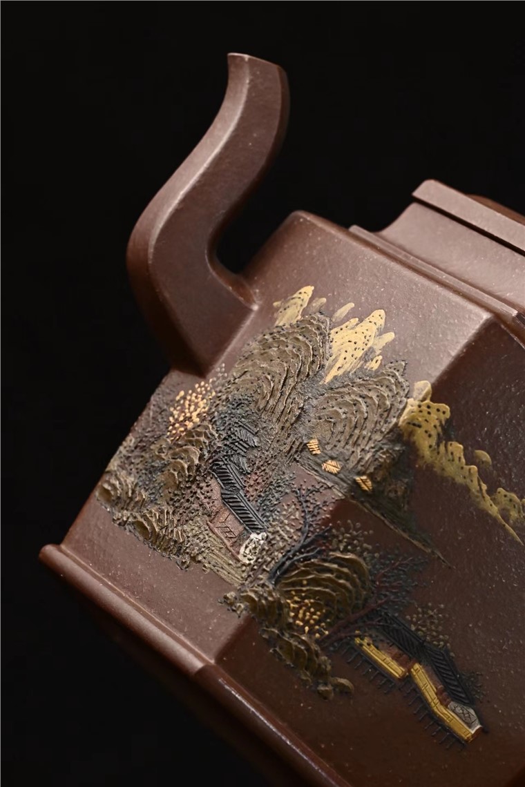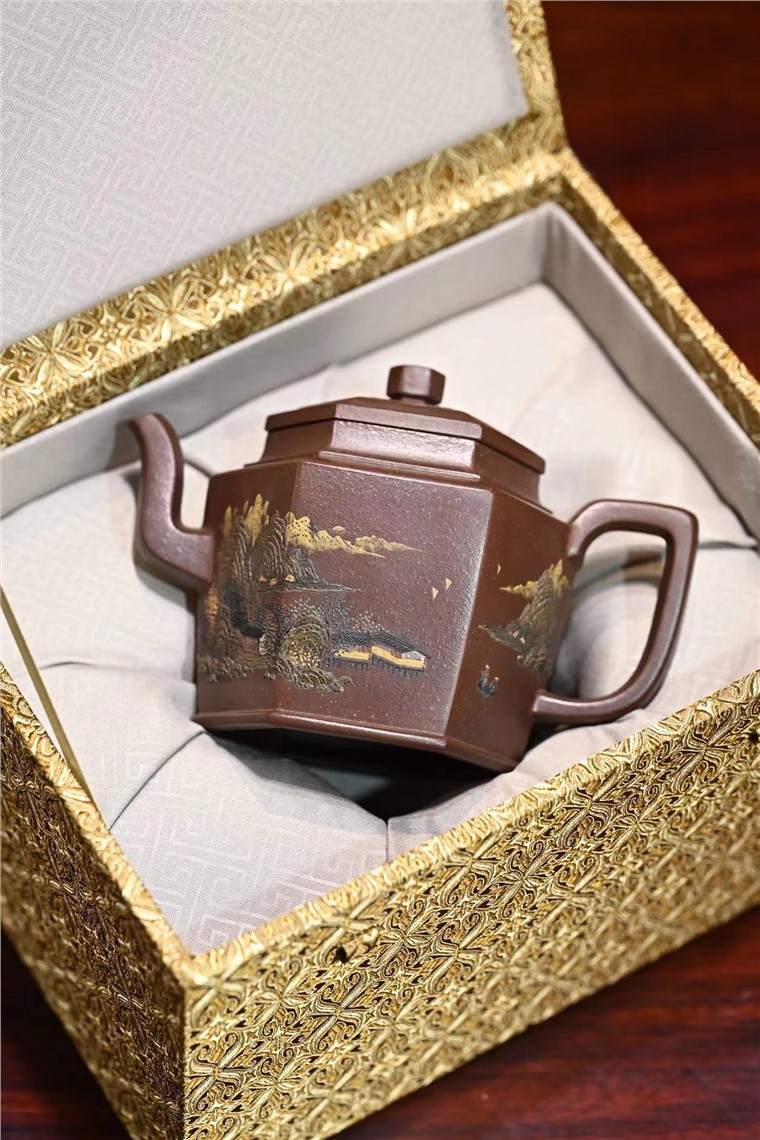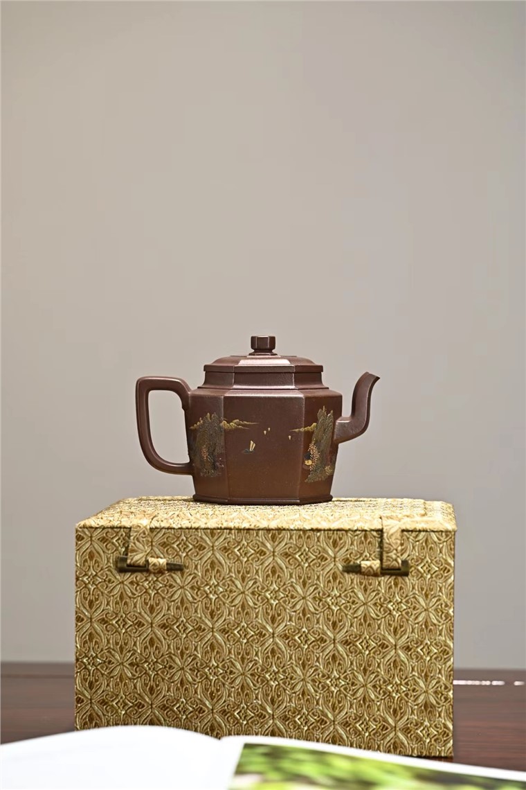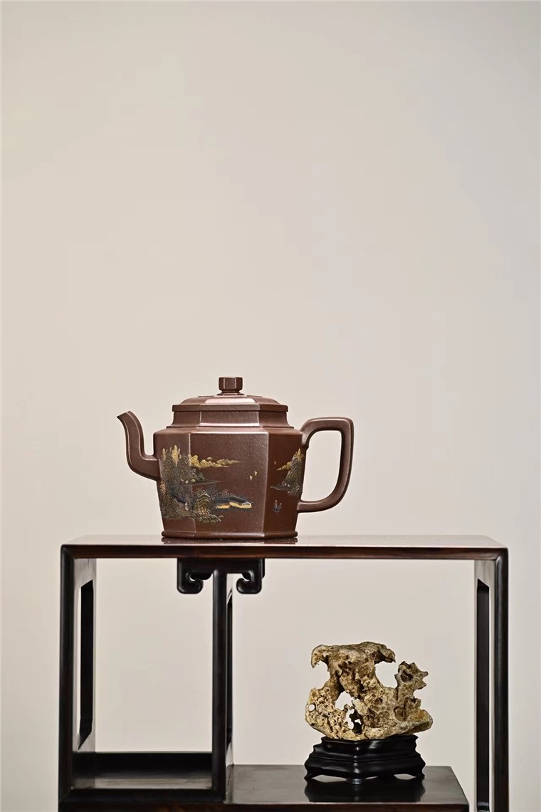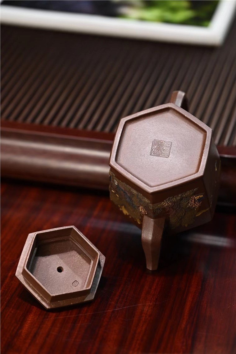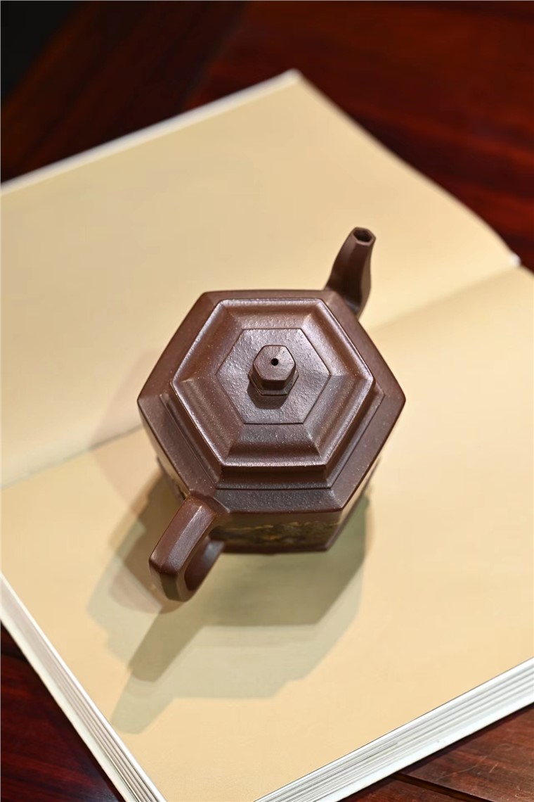 壶身张弛有度,开阖得宜,六方造型祥瑞富有灵气,线面挺括有力,立体而正直。全器气势挺拔,洁净明朗英姿飒爽, 古朴典雅,浑厚大气,壶清而不浊,雅而不俗。