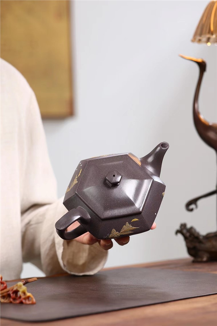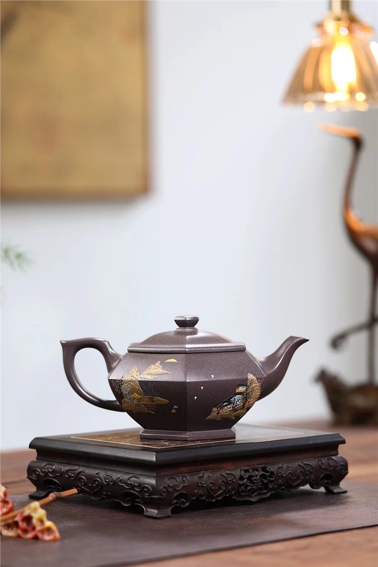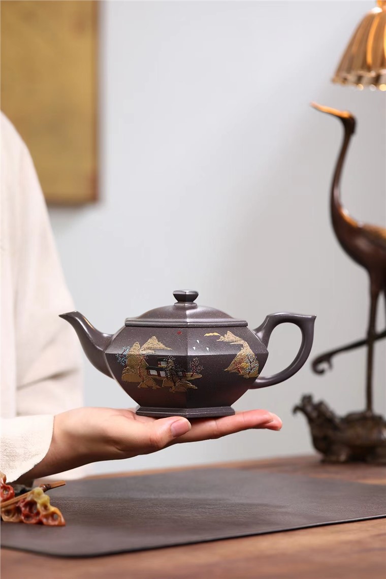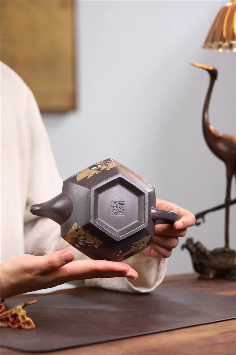 此款壶身以泥绘装饰山水图,巧妙地布局浓淡虚实,远近渐次深浅,呈现出变化多端的景象。寄情山水的雅致情怀在壶身上尽情展现,古补的意境更加深远,格调幽雅,让人陶醉其中。【六方汉云】的创意和精湛的制作工艺,为刘军作品增添了独特的艺术魅力,使其作品备受收藏和欣赏的喜爱。