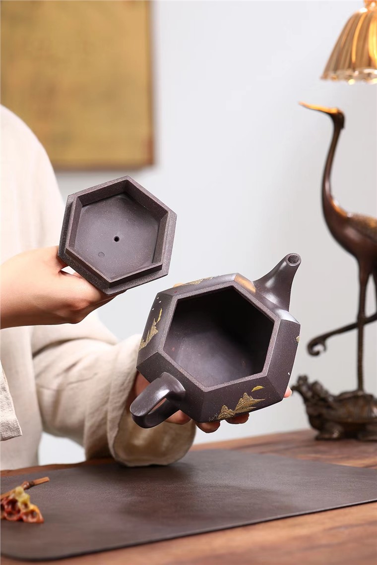 【六方汉云】的设计别出心裁,打破传统圆润的造型,而是采用六方设计,赋予了整体更加刚毅的气质。壶身被均等分为六等分,钮、流、把皆以方器的展现,协调有致,和谐统一。折腹外鼓,折线延伸至壶嘴,与把在视觉上保持了平衡,呈现出行云流水般的线条之美。整个造型简练而又挺拔,兼具柔美与刚毅,曲折中富有变化,柔美中带有劲韧,彰显出老辣干练的气息,令人赞叹不已。